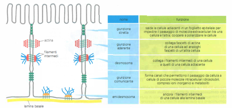 • interazioni cellula-matrice, mediate da integrine e da specializzazioni come gli emidesmosomi, che collegano i filamenti intermedi alla lamina basale attraverso laminina e collagene di tipo IV;