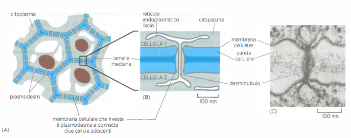 Le cellule vegetali sono collegate da plasmodesmi. (A) I canali citoplasmatici dei plasmodesmi traforano la parete della cellula vegetale e collegano l’interno di tutte le cellule di una pianta. (B) Ogni plasmodesma è rivestito da una membrana cellulare comune alle due cellule comunicanti. Di solito contiene una sottile struttura tubulare, il desmotubulo, derivante dal reticolo endoplasmatico liscio. (C) Fotografia al microscopio elettronico di un plasmodesma.